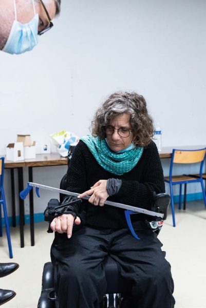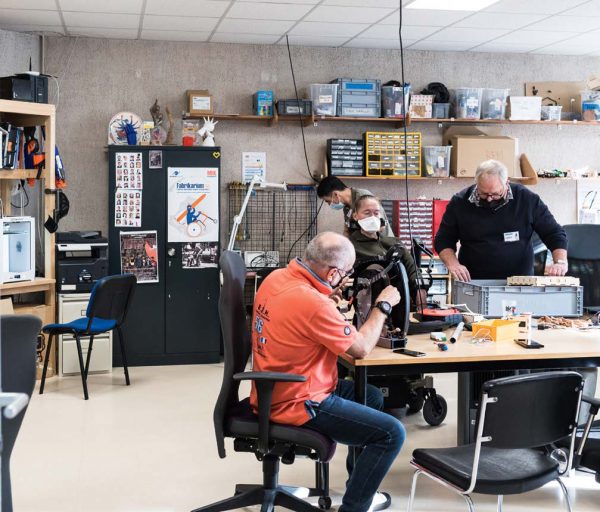 Toute l’équipe se réunit pour un premier point. Autour d’Adamou, comme le veulent les règles du jeu, se pressent des gens venus de tous horizons: Mathieu, du human lab de Brest, Sophie et Jérôme, ingénieurs chez Ariane Group, une des entreprises partenaires de My Human Kit, André et Suliane, respectivement bénévole et coprésidente de l’association, et Laure, sociologue. Soit un agglomérat de compétences diverses répondant aux besoins d’Adamou. Parce qu’une autre des forces des human labs, et encore plus du Fabrikarium, c’est l’intelligence collective. “Alors André, tu nous racontes ?”, lance Jérôme. “On a essayé d’utiliser un frein de vélo d’enfant embarqué, et pour l’instant, ça marche !, répond l’intéressé. Rien ne m’arrête dans la construction. Mais, en série, je ne sais pas faire.” Et ça tombe bien, parce qu’ici, pas question de faire du standard, tout est fabriqué au gré des besoins.