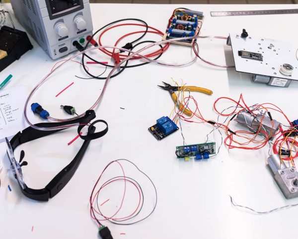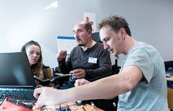 Le jour J, les participants se réunissent chez Askoria, un centre de formation aux métiers sociaux, dans des locaux sans charme comme il y en a tant d’autres. Sous les néons, l’entrain est palpable, on discute par petits groupes autour de café et de viennoiseries. “Tout le monde papote, c’est sympa, mais l’heure tourne: allez, au boulot !” C’est avec ce signal lancé par Delphine, coordinatrice de projets chez My Human Kit, que le hackathon commence. Top départ. Disciplinées, les six équipes rejoignent les pièces de leurs projets respectifs pour se mettre au travail. En salle B trône Adamou, venu du human lab de Brest avec son projet de Tritinette destiné à améliorer sa mobilité – le jeune homme souffre d’une paralysie partielle de la jambe gauche. “Je me sers déjà de la version 2 du prototype pour aller travailler. Mais il reste ce problème du poids, des roues trop grandes, et d’un moteur encombrant. Pendant ce hackathon, on va réaliser la V3 qui sera plus légère et pliable. Au fur et à mesure, on trouve des solutions et on a de plus en plus d’exigences !” La recette? Prenez une trottinette manuelle lambda, dont les matériaux existants vont être détournés, motorisez-la avec une batterie d’hoverboard pilotée avec un contrôleur acheté en grande surface, ajoutez-y une troisième roue pour plus de stabilité, et voilà le travail. Le tout avec des éléments faciles à trouver, pour que n’importe qui puisse la fabriquer, selon les principes fondamentaux de tout lab qui se respecte: le partage et l’open source, qui permettent de répliquer facilement la trouvaille.