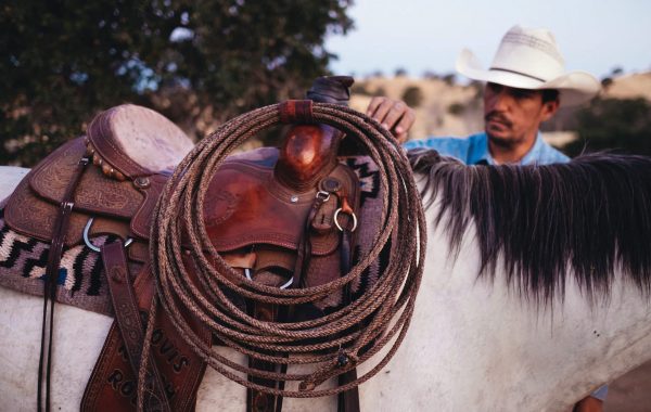 Lasso enroulé sur la selle, chapeau contre le soleil et la pluie, chaps aux franges de cuir pour se protéger les jambes… Des accessoires indispensables, hier comme aujourd’hui. © Eugénie Baccot